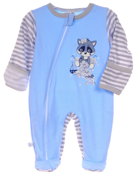 Erstlingsset Strampler Mütze Hemdchen Baby Anzug in Blau mit Waschbär Aufdruck