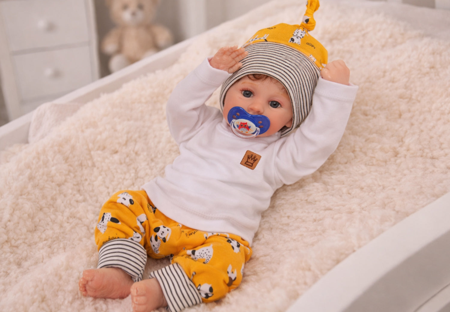 Vervollständigt wird das Set durch eine passende Knotenmütze im gleichen Design wie die Hose, die das Babyköpfchen angenehm warm hält und den Look harmonisch abrundet.