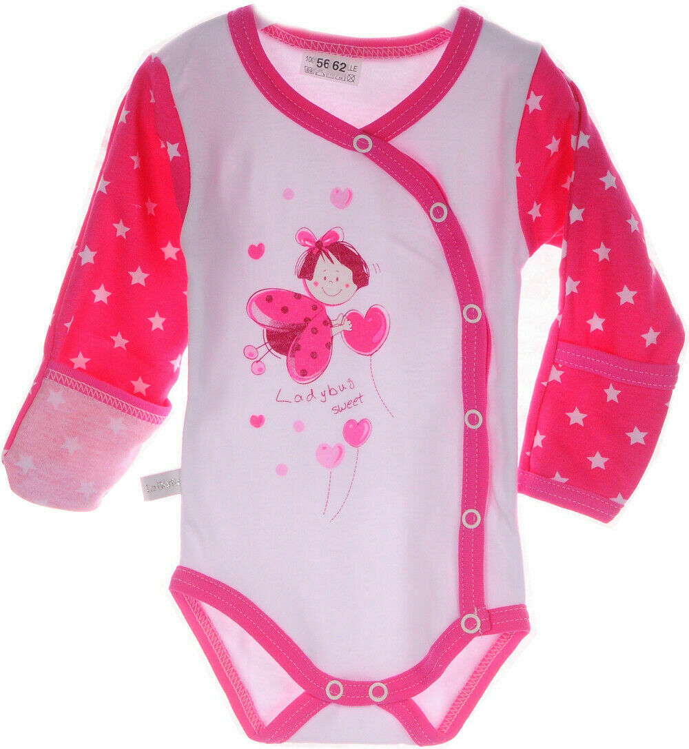 Langarmbody im Wickelschnitt aus wechem Baumwollstoff. Mit Druckknöpfen an der Seite und im Schritt. Body hat Kratzschutz und extra lange Ärmel, damit das Baby die Arme und Hände gut ausstrecken kann.