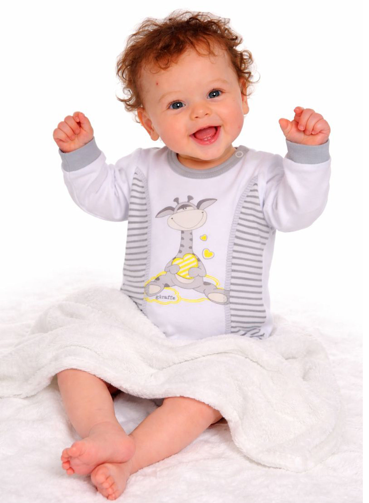 Weicher und hautfreundlicher Baby-Langarmbody in einem zeitlosen weiß-grau gestreiften Design mit niedlichem Giraffen-Aufdruck. Gefertigt aus 100 % reiner Baumwolle, bietet dieser Body höchsten Tragekomfort und ist besonders sanft zur empfindlichen Babyhaut.