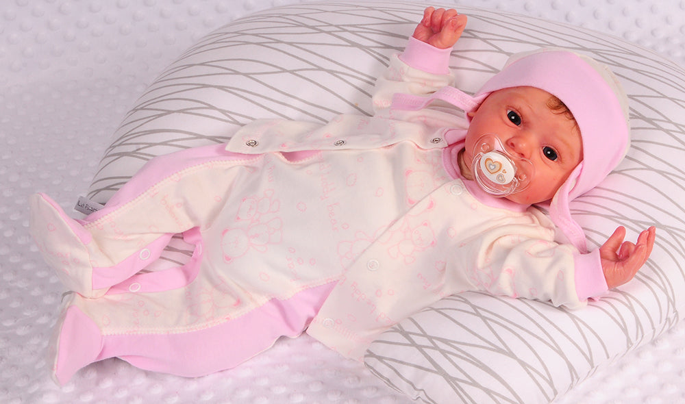 Erstlingsausstattung 3Tlg. Strampler, Hemdchen und Mütze in angenehm weicher Baumwoll-Qualität. Strampler ärmellos, mit Druckknöpfen im Schritt und an den Schultern für ein leichtes An- und Ausziehen. Mütze zum Binden, Shirt mit Druckknöpfen. Material: 100% Baumwolle