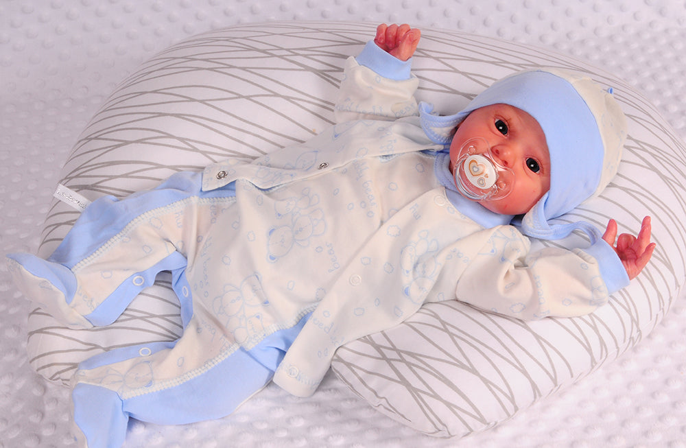 Erstlingsausstattung 3Tlg. Strampler, Hemdchen und Mütze in angenehm weicher Baumwoll-Qualität. Strampler ärmellos, mit Druckknöpfen im Schritt und an den Schultern für ein leichtes An- und Ausziehen. Mütze zum Binden, Shirt mit Druckknöpfen. Material: 100% Baumwolle