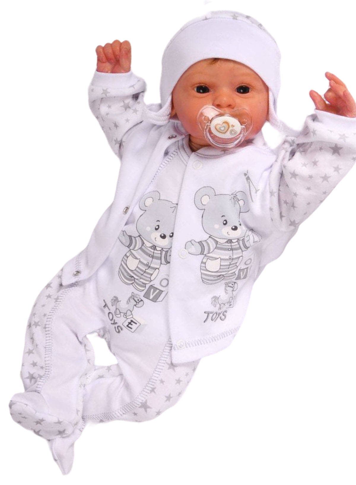 Baby Strampler Hemdchen Mütze Erstlingsset in weiß mit Sternchen und Bären Aufdruck