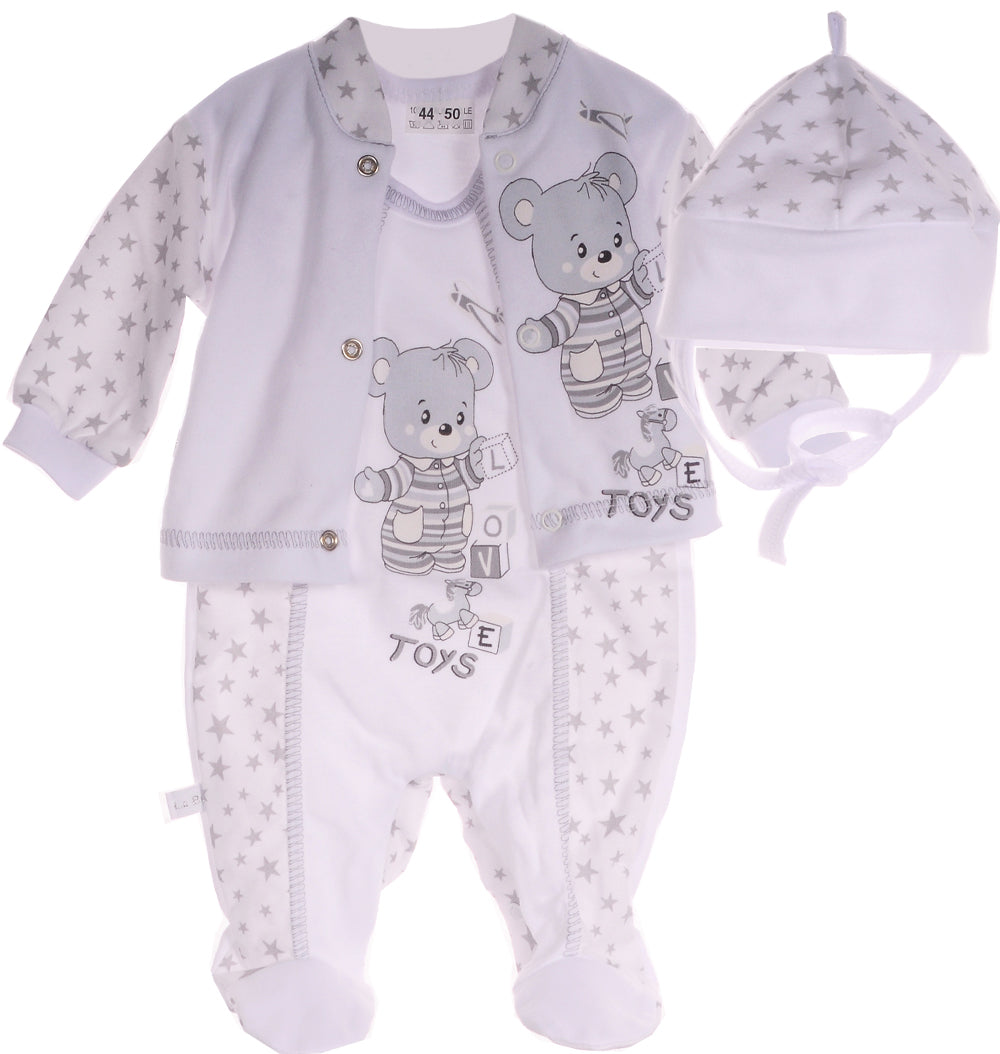 Dieses bezaubernde 3-teilige Set für Babys ist die ideale Wahl für Komfort und Stil. Es umfasst einen ärmellosen Strampler, ein Langarm-Hemdchen und eine Mütze, alles in Weiß mit einem niedlichen grauen Sternchen-Muster. Der Strampler ist in der Mitte mit einem liebevollen Bärchen-Aufdruck verziert, der für einen besonders charmanten Look sorgt.